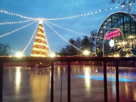 Перед Новым 2026 годом Болотная площадь стала одной из новогодних локаций. На ней работала усадебная почта, но открытки с усадьбами Москвы и маршрутные листы по усадьбам к моему приезду уже закончились. Я любовалась новым катком с ёлочкой посередине