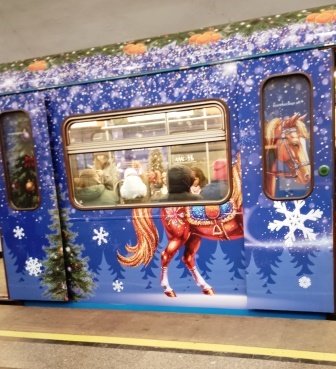 . Таких я ещё не видела. Каждый вагон украшен по-зимнему. Всего на одном поезде разместили более 700 объёмных фигур: снеговиков, ёлок, снежинок и ёлочных шаров. По поводу названия поезда мнения расходятся — то ли «Снеговичок», то ли «Зимний».