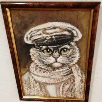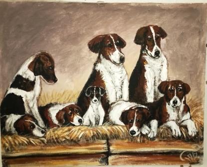 В 2025 году центр проводил двухдневную выставку «Вселенная собак». В описании к выставке было написано, что экспозиция объединит живопись, скульптуру и графику, где главными героями станут четвероногие друзья. Мы должны были увидеть, как разные эпохи и стили — от реализма до авангарда — отражают образ собаки в искусстве. Обещали даже отдельный блок, посвящённый историям и мифам, которые веками вдохновляли художников. Конечно, я была разочарована. На втором этаже было два блока, один из которых был посвящён собакам, а другой — кошкам, причём много было детских рисунков в обоих блоках. Разные эпохи и стили? На мой взгляд, все работы были современные, потому что под каждой работой была написана цена. Вряд ли работы известных художников можно было продавать за восемь тысяч рублей. Скульптур я не обнаружила. Может, их уже расхватали? Сфотографировать захотела одну картину в блоке «Собаки» («Перед охотой»