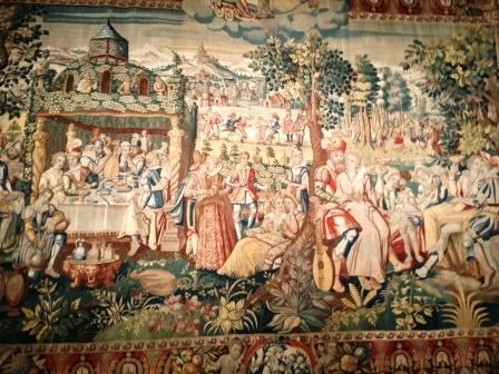 Параллельно проходила ещё одна выставка — «Благороднейшие из тканей. Западноевропейские шпалеры XVI-XVIII веков». Шпалеры были дорогостоящими украшениями и незаменимыми в быту предметами интерьера: они утепляли помещения и скрывали грубую кладку каменных стен. Понравились все. Сфотографировала одну — «Сад любви»
