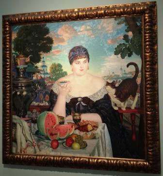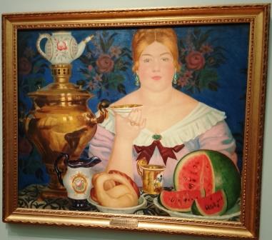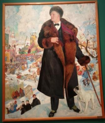 . Экспозицию открывают изображения членов семьи Кустодиева — жены, дочери, брата. Большая часть жизни художника была связана с театром, где он тоже изображал купечество.