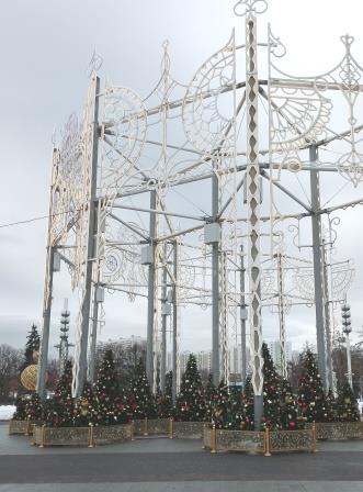 Перед Новым годом ВДНХ входит в число мест, рекомендованных к посещению. Очень красивые новогодние инсталляции установлены уже перед главным входом. Это и устремлённые вверх колонны на фоне световых глобусов