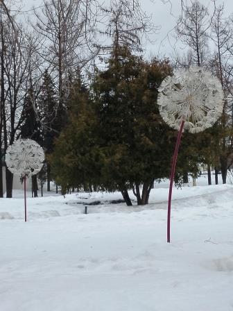В Международный Женский день 2026 года на ВДНХ ещё сохранились новогодние инсталляции — одуванчики и елки в окружении световой беседки. При дневном свете они выглядят так: