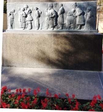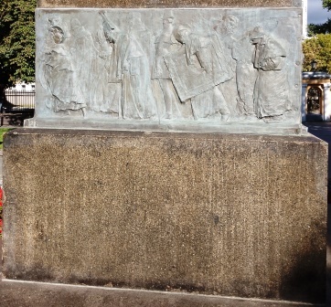 (фигуры едва намечены рельефом, они словно растворяются в петербургском тумане; в конце процессии кутающийся в плащ Акакий Акакиевич из «Шинели» и завершает процессию Нос в мундире и шляпе статского советника.),