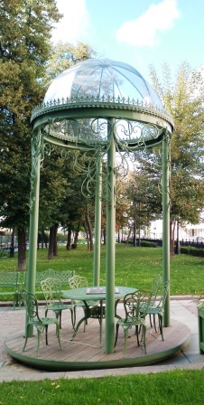 Летом 2025 года бульвар украсили в рамках проекта «Лето в Москве». Я обнаружила три одинаковые беседки в стиле а-ля XIX век