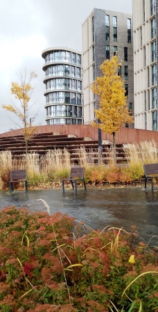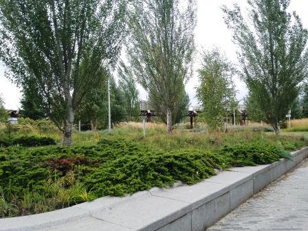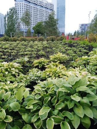Одним из решений ландшафтного дизайна было показать перепад высот. Уровень зелёных насаждений, променадов и тротуаров меняется вместе с палитрой растительности определённой зоны