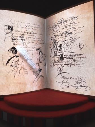 . Скамейки представляют собой открытые книги. Ещё одна отдельно стоящая трёхметровая книга сама переворачивает свои страницы с текстами Пушкина